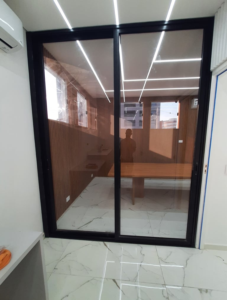 Realizamos serviços como vedação de fachadas, pele de vidro, esquadrias de alumínio, vidros temperados, box para banheiro, corrimão, telas mosquiteiras, coberturas, fechamento de sacadas, entre outros.